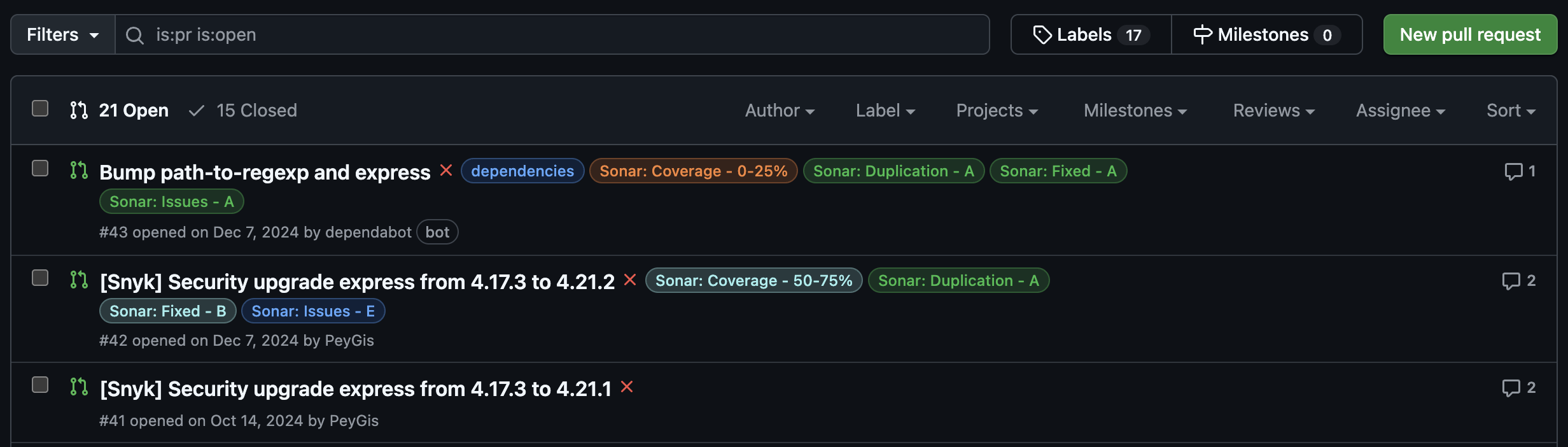 Once a pull request associated with a SonarCloud analysis is updated, the automation will be triggered automatically. It will evaluate the latest scan results and apply color-coded labels to the PR, reflecting the quality status of the code.