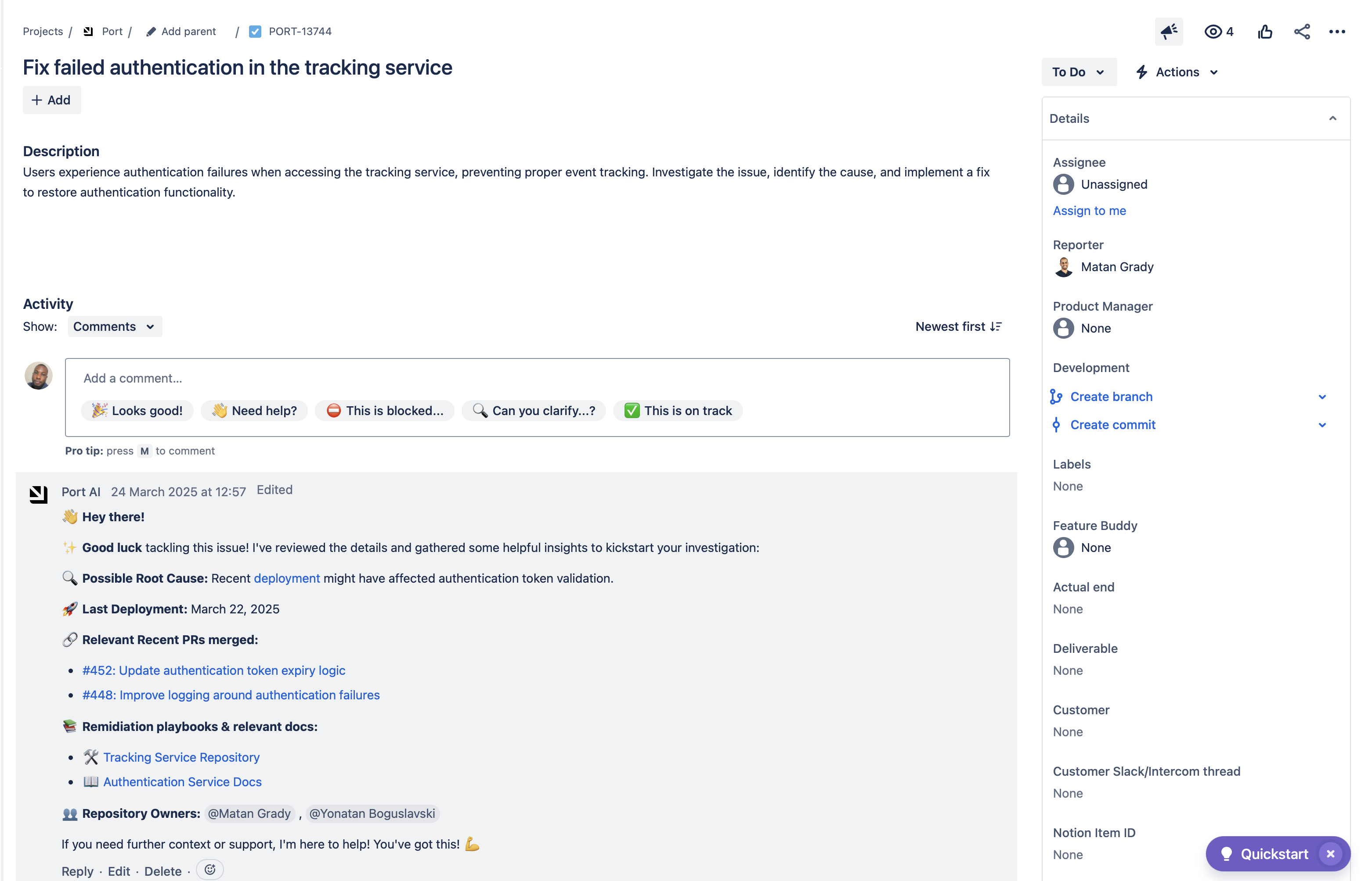 • Port's Jira integration for projects, tasks and issues.