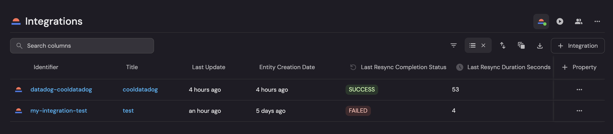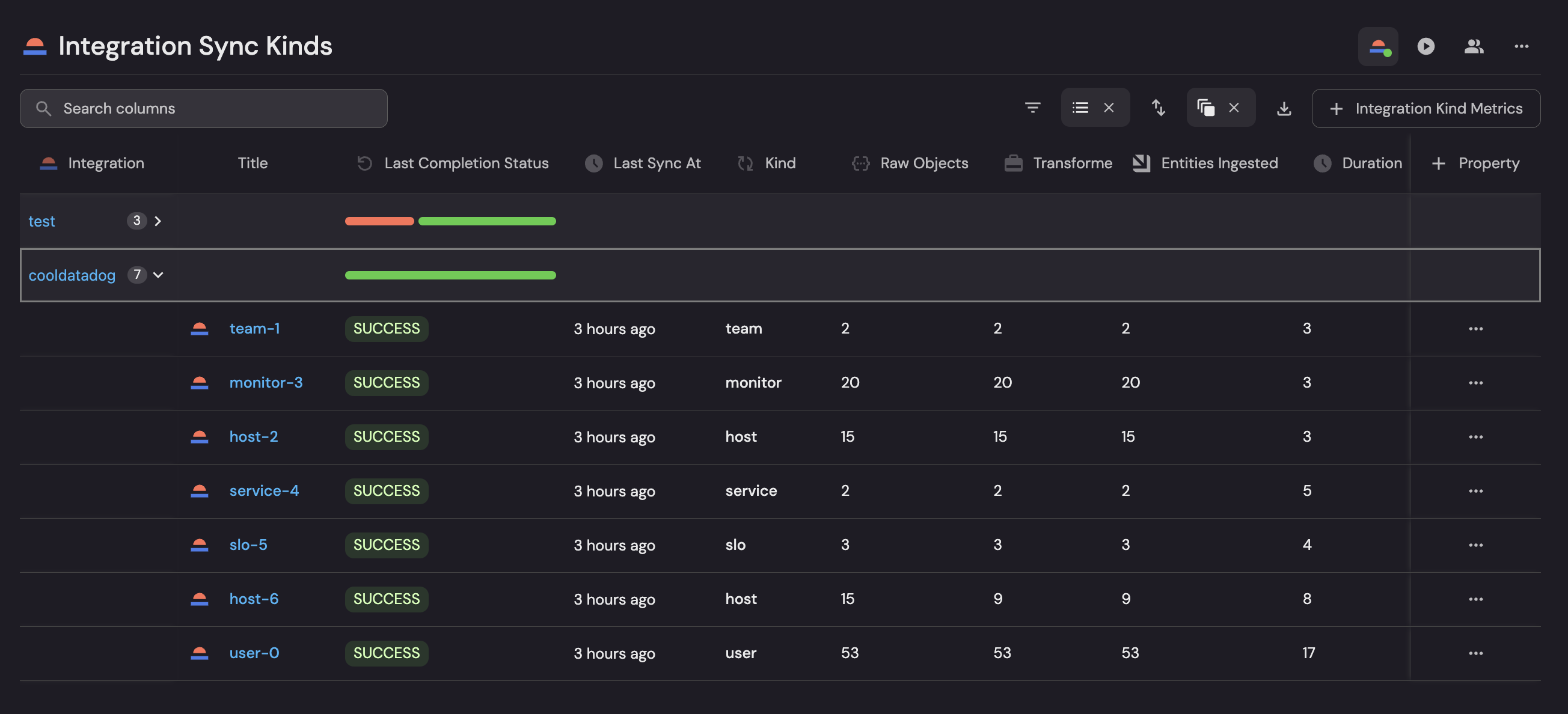 • Track sync status and timing across different integration kinds