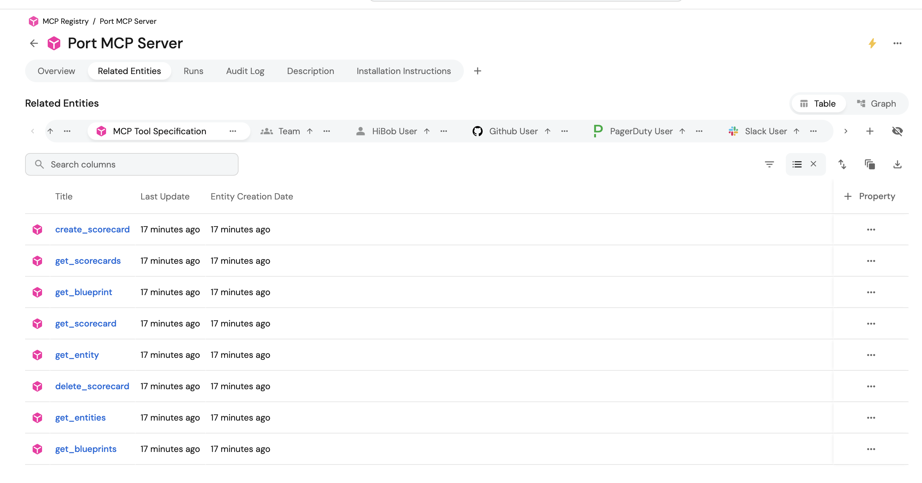 • Creates or updates tool entities in Port's mcpToolSpecification blueprint, linking them to their parent MCP server