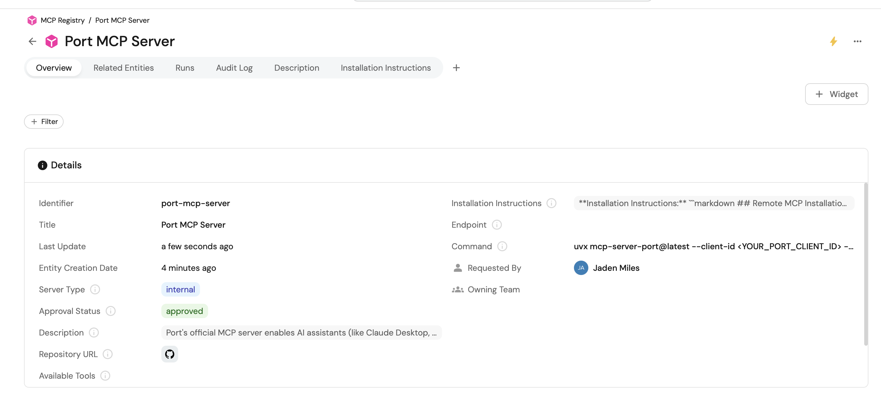• Fetches all MCP servers from your Port catalog that have a command property defined