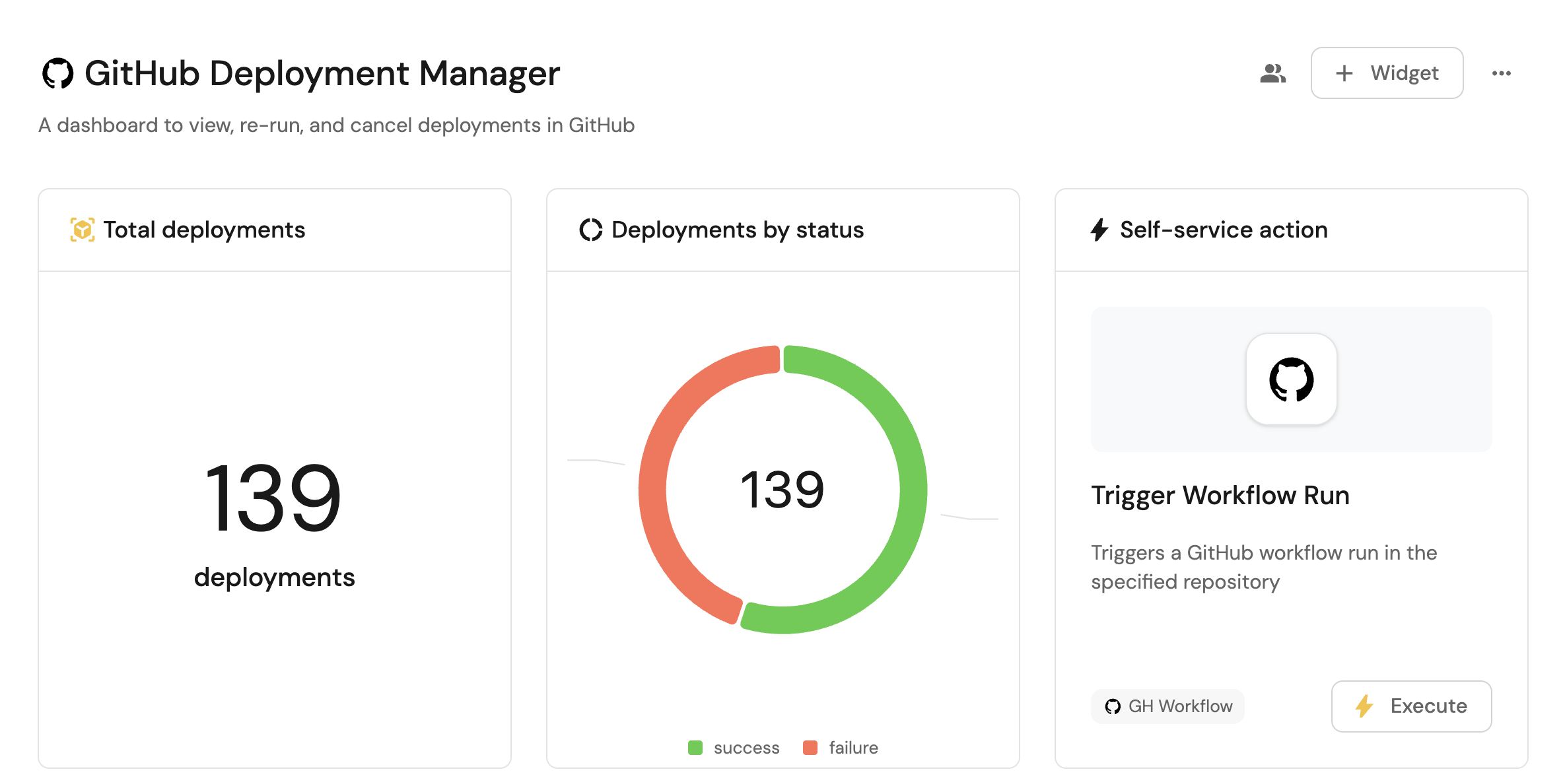 With workflow runs ingested and actions configured, the next step is building a dashboard to monitor GitHub data directly in Port. We can visualize all workflow run details using customizable widgets. In addition, we can trigger remediation workflows right from your dashboard.